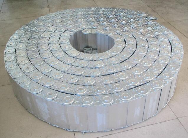 鋼鋁拖鏈的彎曲半徑必須大于內(nèi)置的管件可彎曲的最大半徑,并留有10%的富余空間,穿線管路較多時應該用隔片分開。